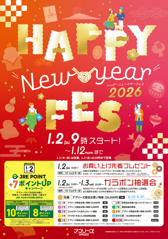 期間中、当日のアプリーズでのお買い上げレシート合算2,000円(税込)毎に1回抽選。
