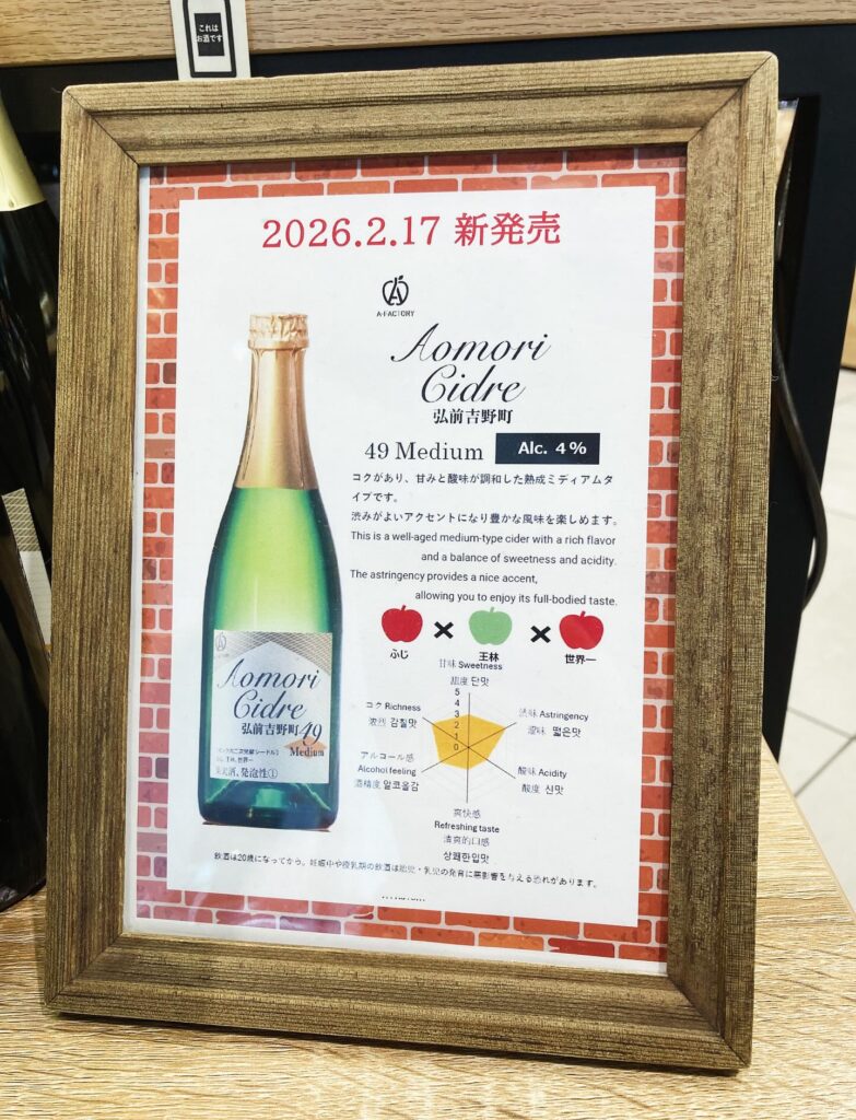 【JR弘前駅2FBRICK A-FACTORY】では、A-FACTORY弘前吉野町シードル工房で作られた、新発売『A-FACTORY AOMORI CIDRE 弘前吉野町49(Medium)』を販売しております。