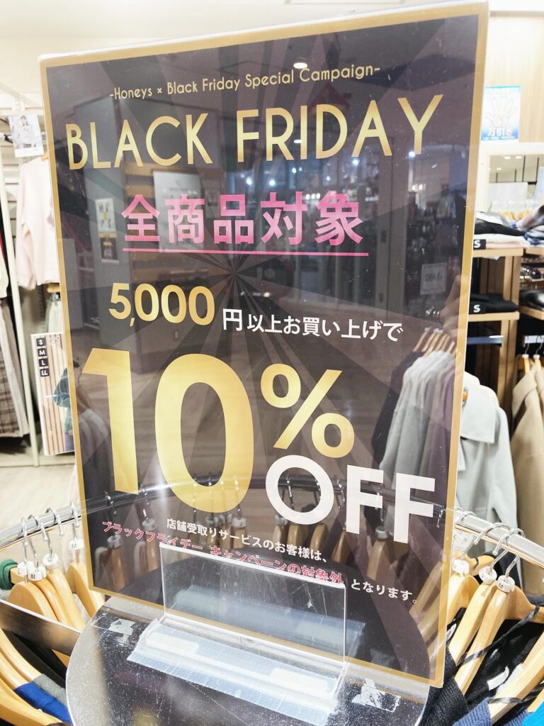TOP イベント・キャンペーン ショップガイド フロアガイド 施設案内 決済方法 アクセス・駐車場 免税対象店舗 求人情報 お知らせ お問い合わせ 会社案内 個人情報の保護について JR東日本グループコンプライアンス相談窓口 ウェブサイトのご利用について ソーシャルメディアポリシー ホーム イベント・キャンペーン 【終了】『BLACK FRIDAY』開催中!! ハニーズ 【終了】『BLACK FRIDAY』開催中!! ~11/30(日) 2025/11/21(金) ショップニュース 【2Fハニーズ】では、11/30(日)まで『BLACK FRIDAY』を開催中!! [全商品対象] SALE品を含む5,000円以上お買い上げで10%OFF!! ※店舗受取サービスのお客様は対象外です。 コートやニットなどこの機会におまとめ買いをしませんか? @honeysofficial 一覧へ