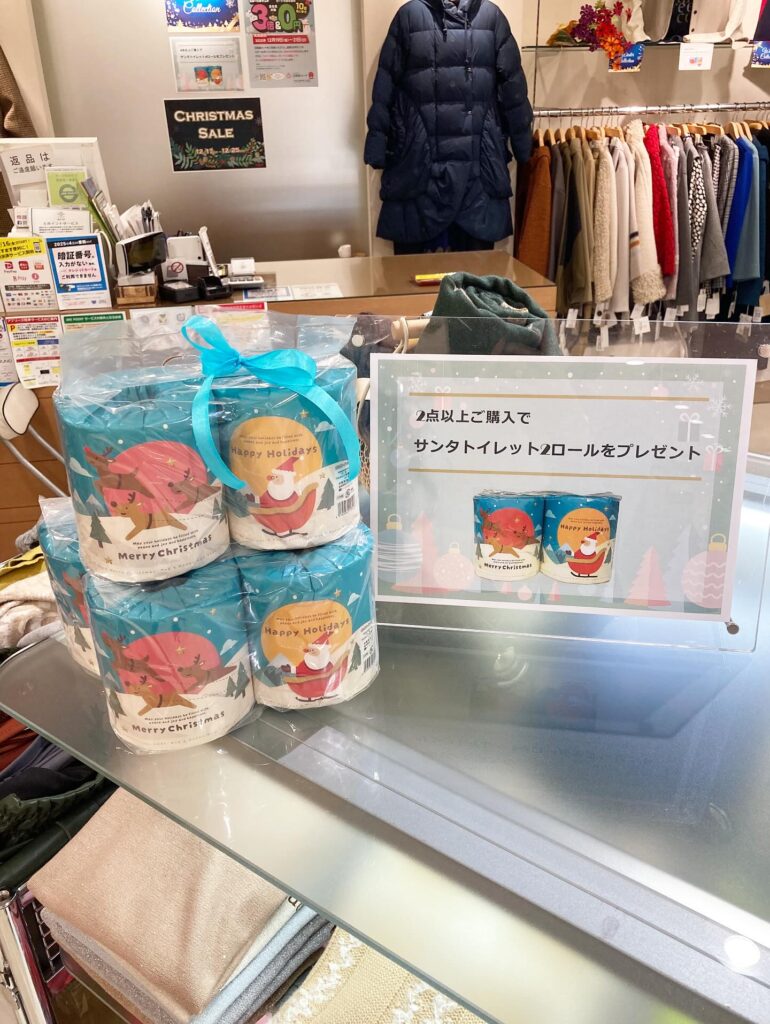 【3Fブティックえま】では、2点以上お買い上げで「サンタトイレットペーパー2ロール」をプレゼント!!