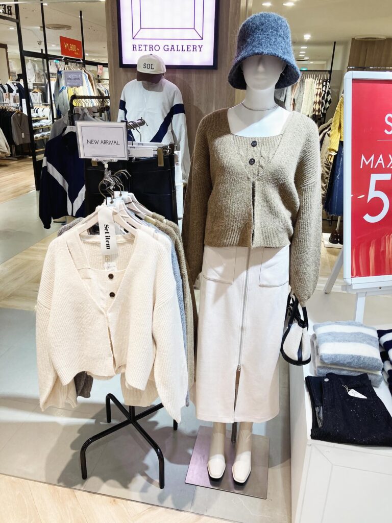 さらにレイヤードに使える無地対象ニット2点お買い上げで2,200円です。