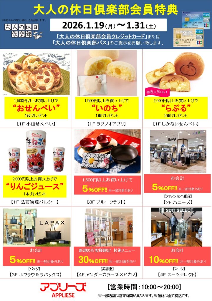 アプリーズでは、「大人の休日俱楽部パス」の期間中、お得な特典サービスをご用意致しております。