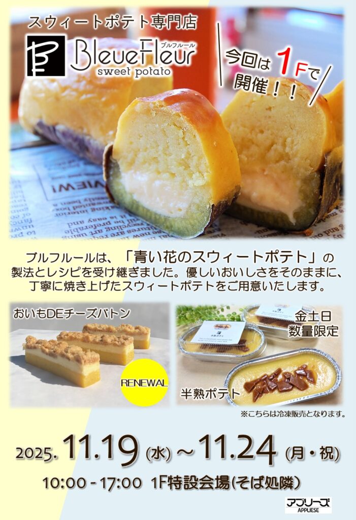 11/19(水)~11//24(月・祝)まで大人気の弘前で多くの人に愛された“青い花のスウィートポテト”のレシピと製法を受け継いだ、青森市のスウィートポテト専門店『ブルフルール』が、期間限定オープンします。